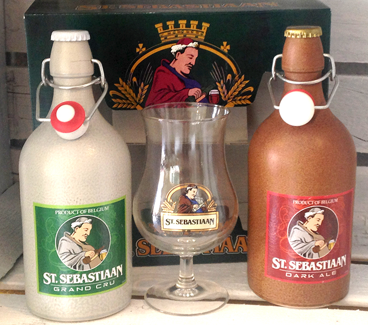 -Una botella St. Sebastiaan Dark. Cerveza de abadía oscura (6,9 %) Su sabor amargo-dulce hace de esta cerveza una especialidad de la región norte de Bélgica.